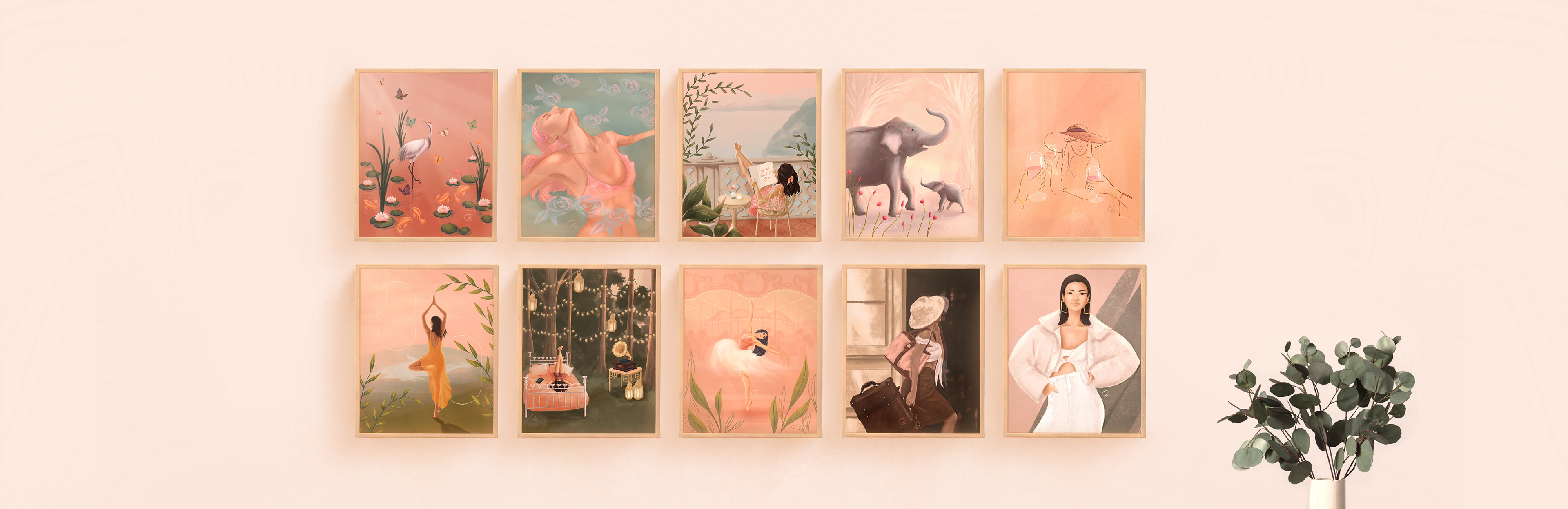 Here shows my illustration signature, two handmade group mockups, and three mockup formats I created by hand to showcase each print on Etsy.